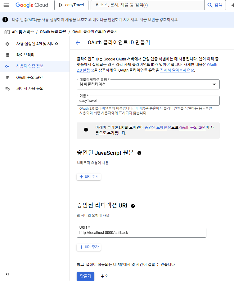 - API 및 서비스 > 사용자 인증 정보 > 사용자 인증 정보 만들기 > OAuth 클라이언트 ID 선택