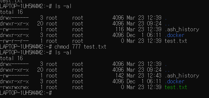 - r:읽기(4), w:쓰기(2), x:실행(1) : 777은 모든 사용자가 모든 권한을 얻는다는 의미