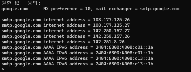 - set type=mx : 메일 수신용 서버 주소