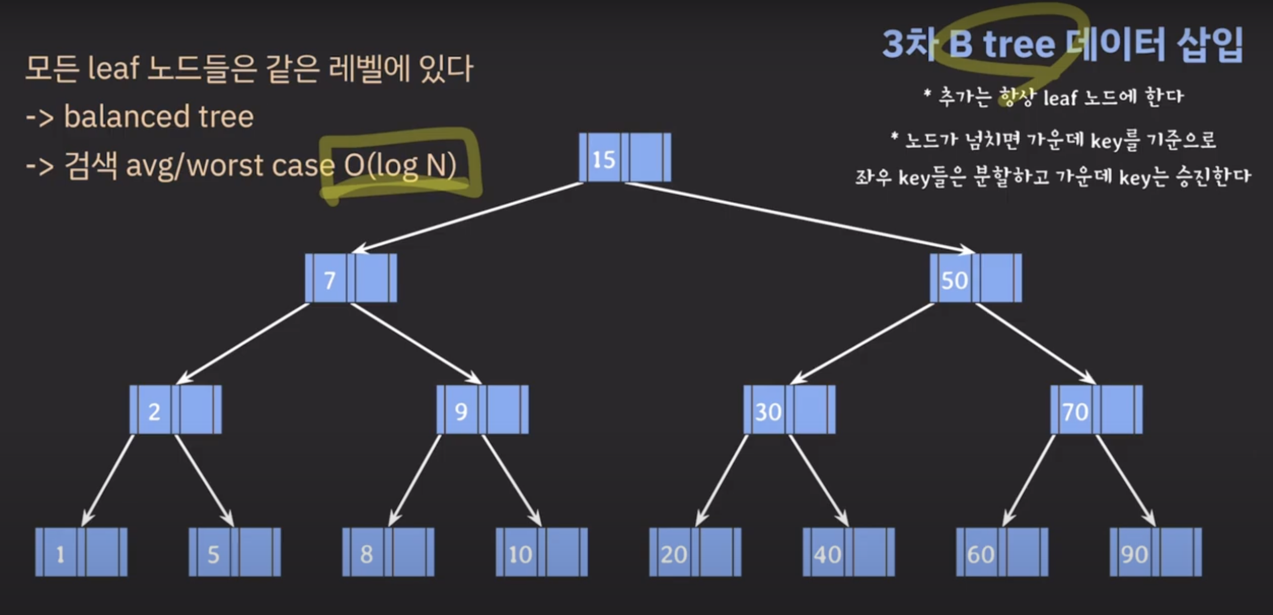 - 제일 왼쪽 자식 노드는 왼쪽 부모 노드보다 작고, 가운데 자식 노드는 왼쪽 부모 노드보다 크고 오른쪽 부모 노드보다 작다. 오른쪽 자식노드는 오른쪽 부모노드보다 크다 (3차 B tree)